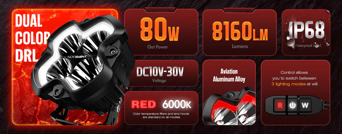 ホワイトメインビーム、ホワイトDRL、レッドDRLは独立したボタンで操作可能。オフロード走行や夜間ドライブでも、操作性と安全性を重視する方に最適。