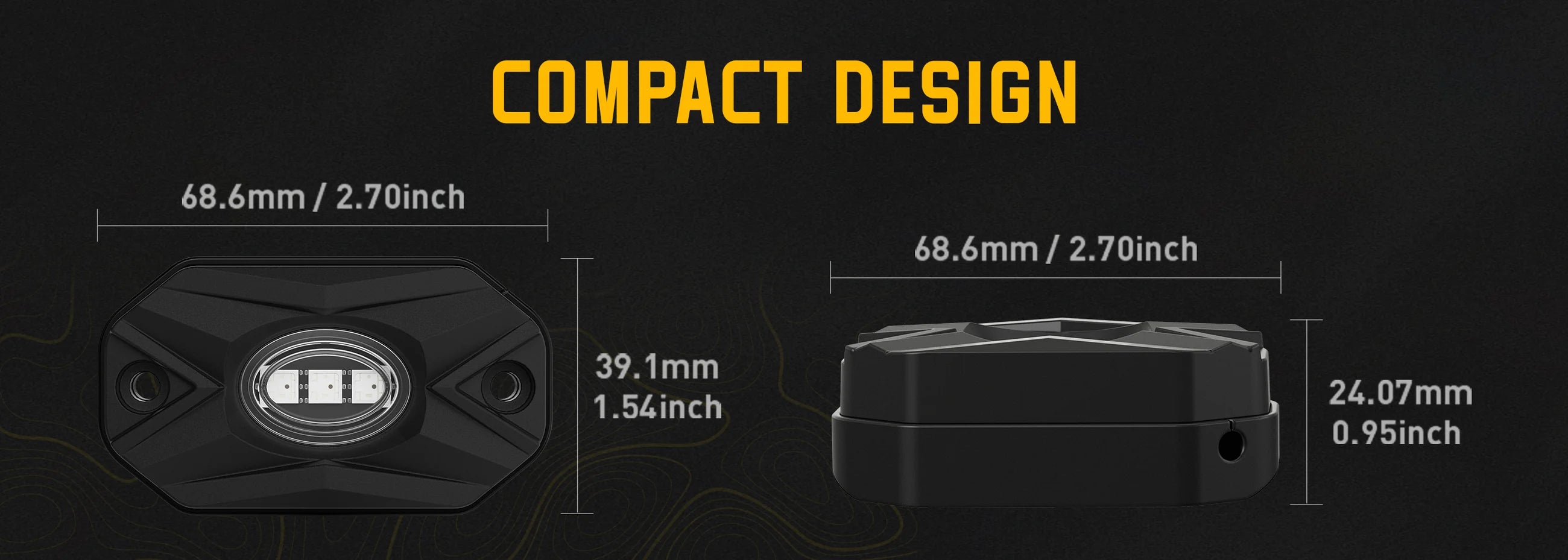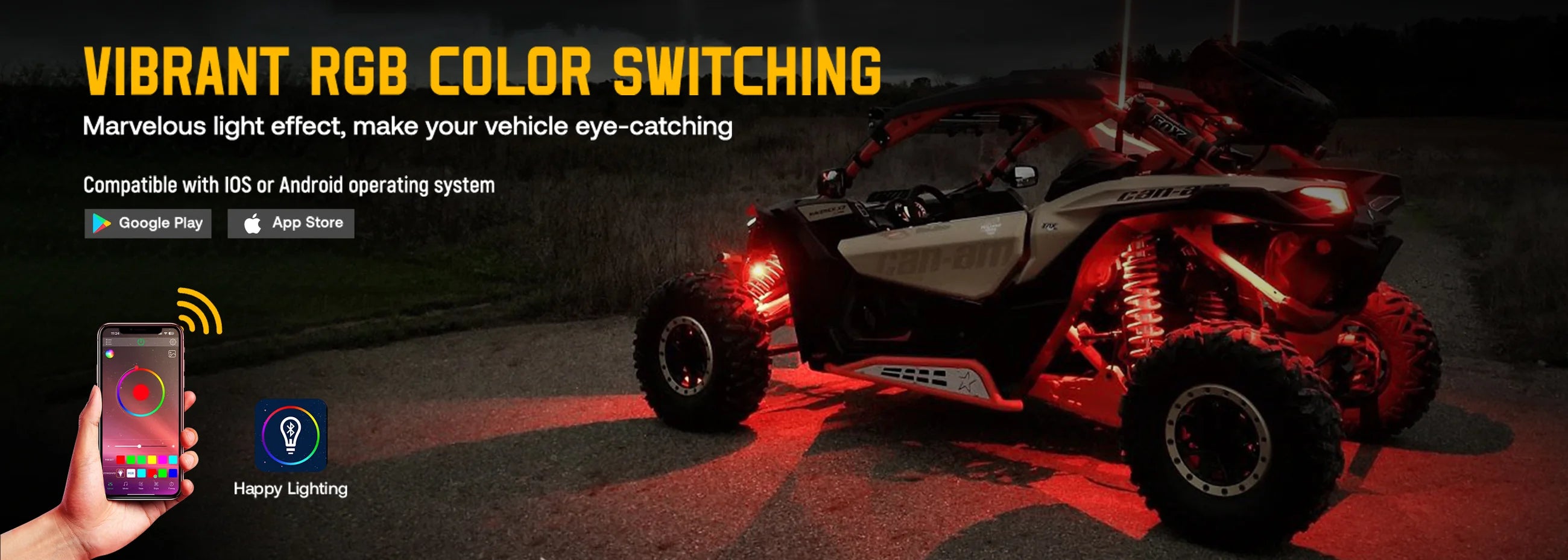 NovSight Rock Lightsなら、スマートフォンアプリ(Android・iOS対応)で簡単に光の色をカスタマイズ可能。白・赤・青など、無限のカラースペクトルから好みの色を選べます。車両の存在感を際立たせるだけでなく、個性を演出しつつ、視界を確保することでオフロードでの安全性もサポート。機能性とスタイルが融合した、究極のオフロード体験を実現します。