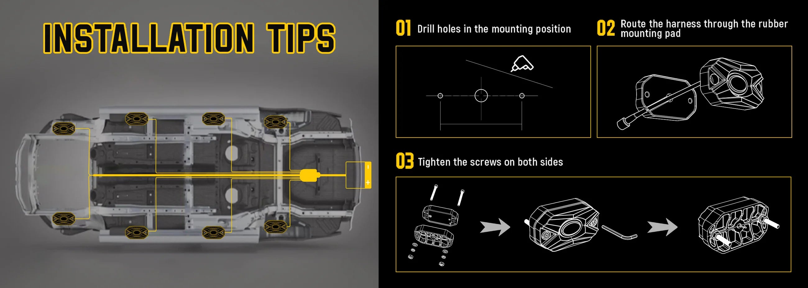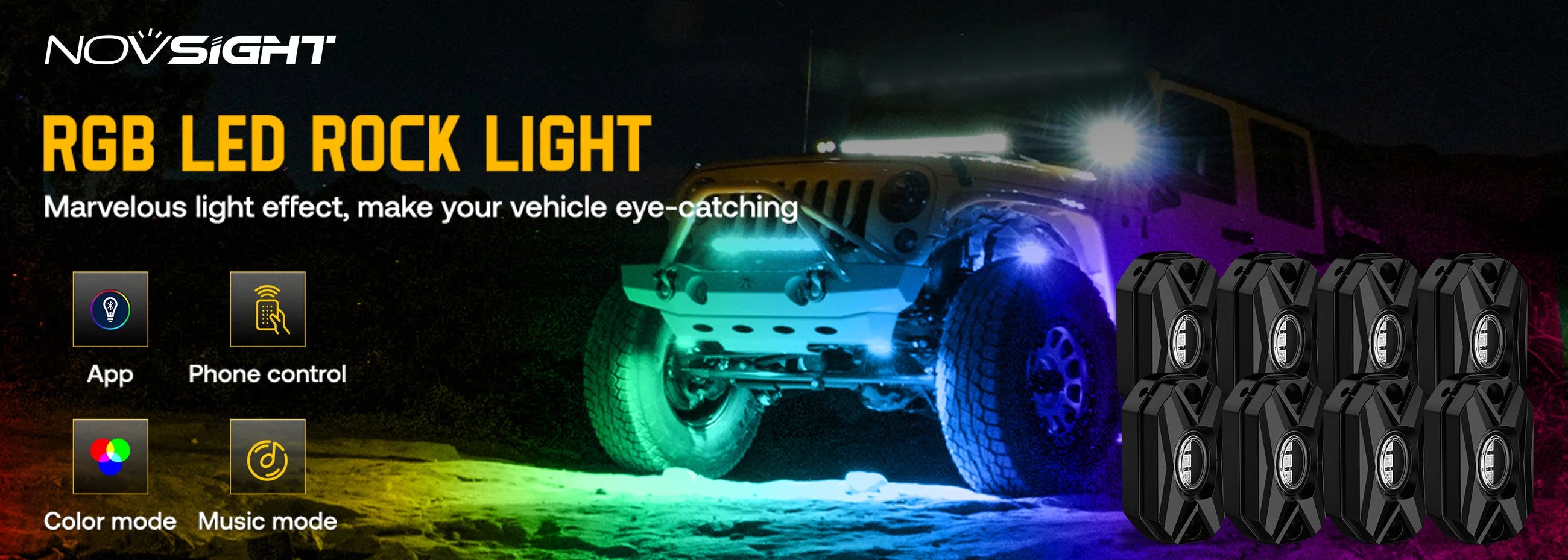 NovSight Rock Lightsは、一般車からSUV、トラック、ジープやサイド・バイ・サイド・ビークル(UTV)などのオフロード車まで、幅広い車種に対応しています。車体下やホイールアーチ周りに設置でき、目を引くライティング演出を実現。雨・雪・霧などの悪天候や、夜間のトレイルなど視界が悪い状況でも安定した明るさを発揮し、安全性を高めつつワンランク上のドライビング体験を提供します。
