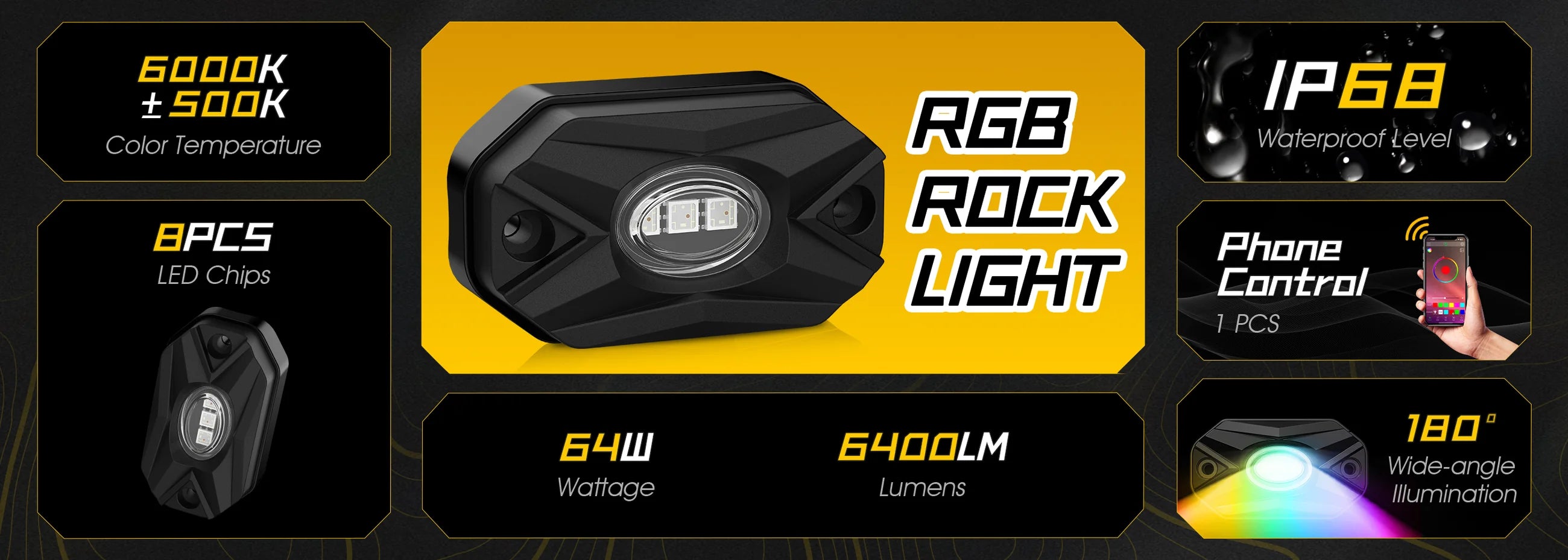 NovSight RGB ロックライト 8個セットは、64Wの出力と6,400ルーメンの圧倒的な明るさを発揮します。スマートコントロールに対応しており、専用アプリで色・明るさ・動的エフェクトを自由にカスタマイズ可能。各ポッドライトは広角180°の光を放ち、周囲をしっかり照らします。複数セットを組み合わせることで、地面の凹凸までしっかり照らし、オフロード走行の視界を完全にサポート。